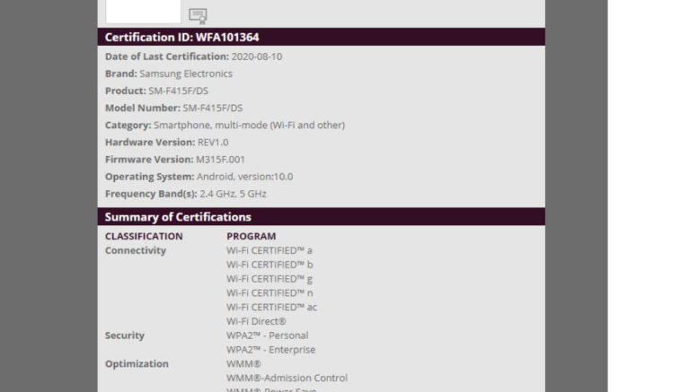 C’est en tout cas ce que pensent certains de nos confrères comme Peter de GSMArena à la lecture d’une nouvelle certification apparue sur le site de la Wifi Alliance. Une certification qui concerne un smartphone Samsung dont la référence est SM-F415F/DS et qui pourrait bien être le Galaxy Fold Lite .