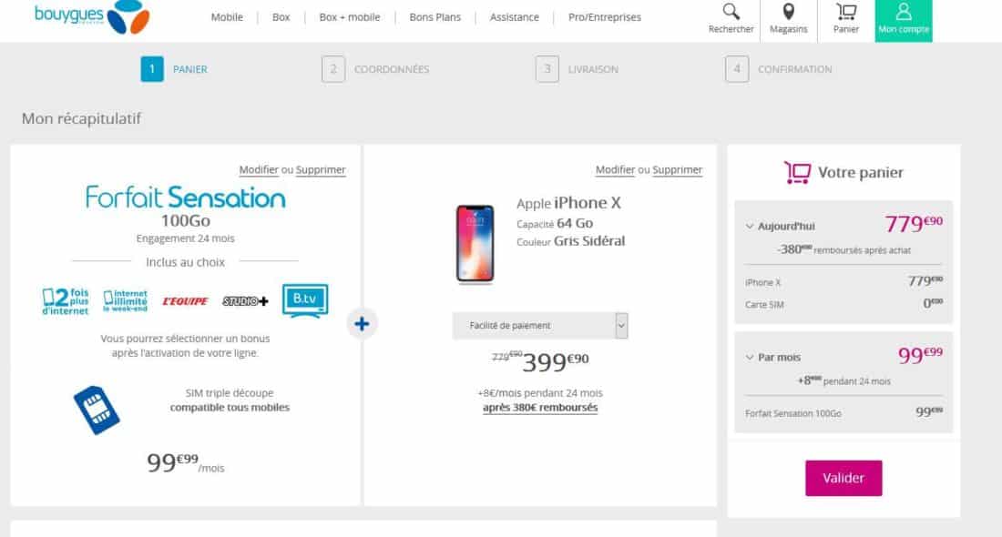 Comme vous pouvez le voir sur notre capture d’écran, le mécanisme semble fonctionner jusqu’à la fin. Évidemment, nous n’avons pas tenté la commande pour un iPhone X. Attention tout de même, il vous faudra prendre le forfait Sensation 100Go à 99€/mois.
