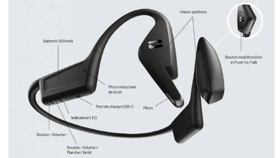 Ce casque se propose comme un casque ultra léger avec un poids de 34 grammes et vient se placer de part et d’autre des oreilles et de la nuque. En outre, le casque est doté d’un excellent rapport signal sur bruit (SNR). De plus il est équipé d’un micro MEMS, qui selon l’entreprise garantit une prise de son optimale. Le casque est également doté d’un second micro qui capte les bruits environnants et les réduit grâce à la technologie « Environmental Noise Canceling » (ENC). Grâce à cette technologie, l’interlocuteur n’entendra que très peu voir pas du tout les bruits ambiants lors d’une communication.