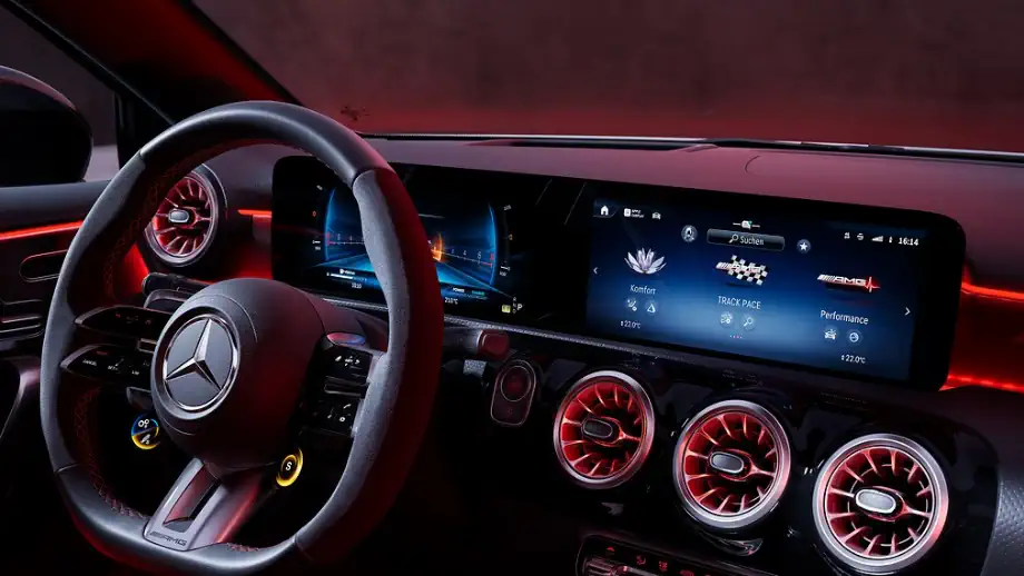 Pour ce qui est de l’intérieur, la marque propose un habitacle équipé de deux écrans, un écran de 7 pouces et le plus grand écran de 10,25 pouces. À noter que la marque allemande propose en option, deux écrans de 10,25 pouces. Des écrans qui permettront d’afficher la dernière génération de MBUX, le système d’info divertissement de la marque.