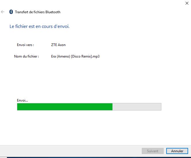 Depuis l’ordinateur, avec le bouton droit de la souris allez sur l’icône Bluetooth (en bas à droite) et cliquez sur Envoyer un fichier. Puis Parcourir. Sélectionnez le(s) fichier(s) à envoyer vers le téléphone. Pour sélectionner plusieurs fichiers, maintenez la touche Ctrl de votre clavier enfoncée et cliquez sur le nom de chaque fichier. Cliquez sur Ouvrir. Cliquez sur Suivant.Vous sélectionnez votre smartphone et cliquez sur Suivant.