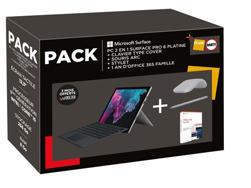- Caractéristiques complémentaires 1 port casque, 2 ports microphone, Connectivité : Surface Connect, Souris Arc : Ultrafine et légère, S’aplatit pour être transportée facilement, Nouveau pavé tactile pour défilements verticaux et horizontaux, Personnalisez votre Surface avec un nouveau choix de couleurs, Connexion Bluetooth Smart 4.0, Nécessite un appareil équipé du système d’exploitation suivant : Windows 8.1, 10, Nécessite également 2 piles alkalines AAA (incluses), Stylet Surface : L’expérience d’écriture digitale ultime, Le compagnon idéal de votre Surface Pro, 4 fois plus précis avec 4096 points de pression, Latence minimale, Connexion Bluetooth 4.0, Nécessite un appareil équipé du système d’exploitation suivant : Windows 10 Creators Update, Nécessite également 1 pile alkaline AAAA (incluse), Microsoft Office 365 Famille – Jusqu’à 6 utilisateurs – PC ou Mac – 1 an : Chaque utilisateur bénéficie d’un compte et accès séparé, Installation sur tous vos appareils (Windows, Mac, iOS et Android), Inclut 1 To de stockage en ligne sur OneDrive par utilisateur, Format : boîte, Année : 2019, Compatible : Windows, Mac, iOS et Android, Licence : abonnement d’un an sans renouvellement automatique