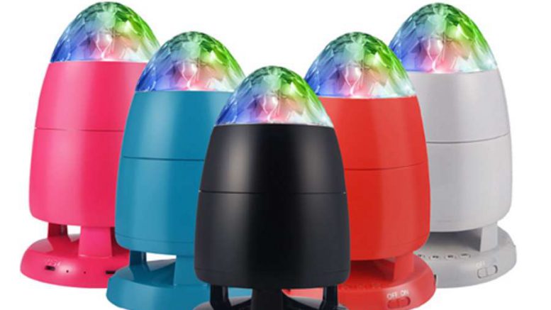 Par ailleurs, l’enceinte s’offre une taille de 155x101mm. Le constructeur annonce également une fonction SUPER BASS. L’enceinte est équipée sur la partie supérieure d’une sorte de kaléidoscope au cœur duquel se trouvent des LED. Ce sont ces LED combinés à ce kaléidoscope qui créeront dans le noir une atmosphère de soirée, à la manière d’une boule à facette.