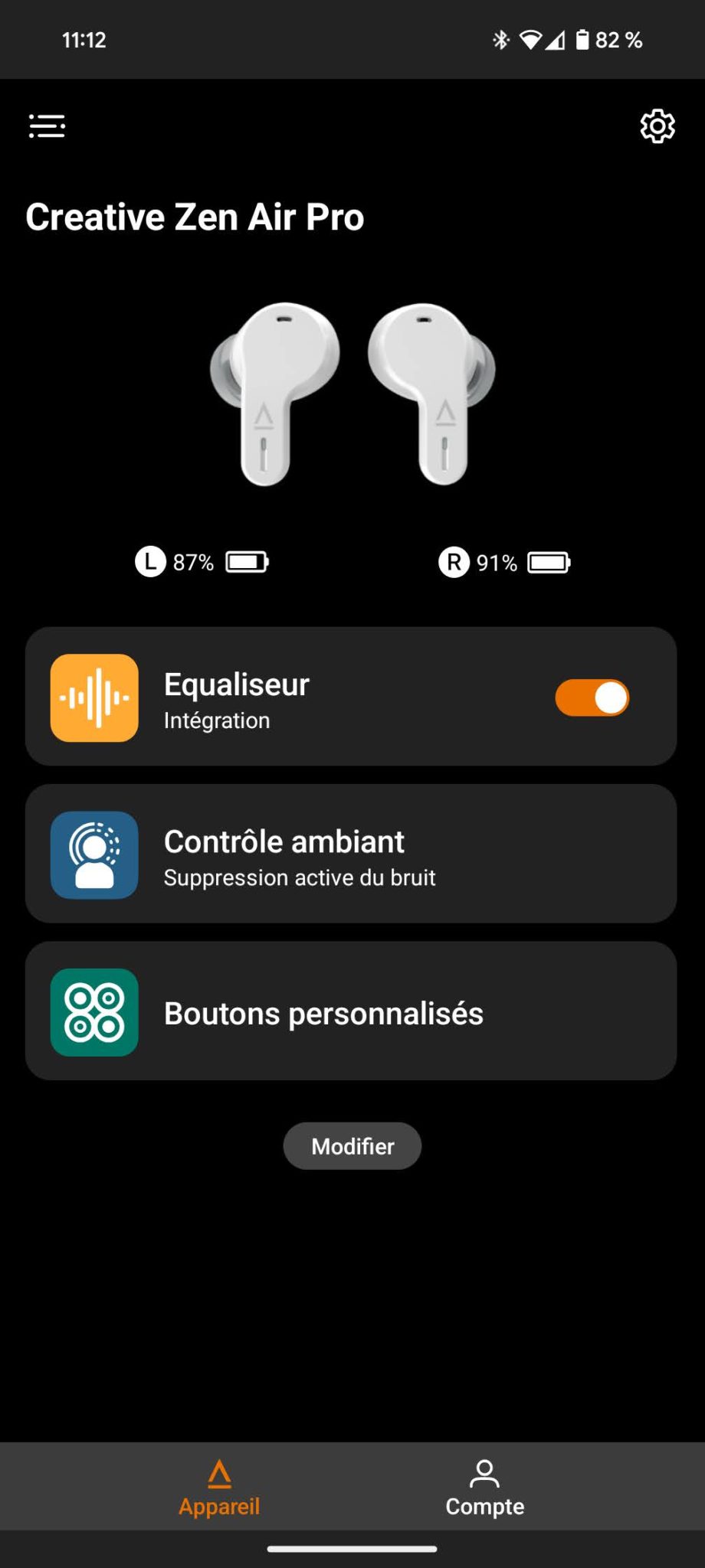 L’application Creative permet de personnaliser les réglages, comme la gestion de la réduction de bruit active et les commandes tactiles. Elle permet également de mettre à jour le firmware des écouteurs et d’ajuster précisément les fonctionnalités, comme les effets sonores, le contrôle du bruit, la qualité audio et les gestes.