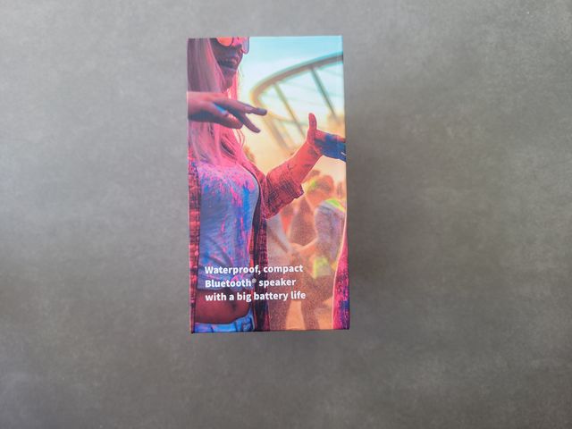 La boite de notre enceinte est colorée dès le départ sur la face avant et sur le côté gauche. Sur la partie arrière et côté droit, nous avons les caractéristiques en différentes langues. Le tout donne une image jeune, sympathique et ambiancée. Cela donne le ton.