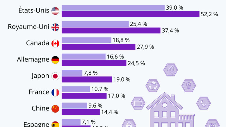 En outre, leur étude classifie également les pays selon le taux de pénétration de la « Smart Home ». Ainsi, en tête du classement on trouve les États-Unis qui ont un taux de pénétration de 52.2% ? Suivi du Royaume-Uni avec 37%.