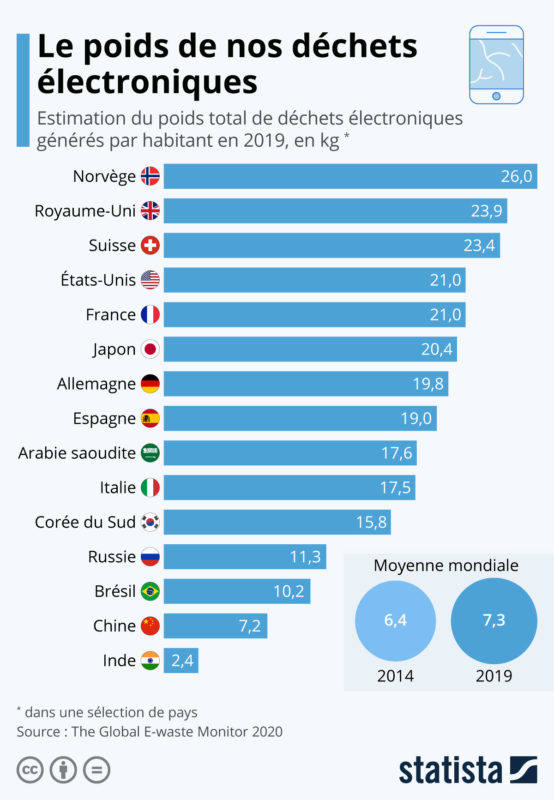 Une étude qui a été faite par le Global E-waste Monitor 2020 annonce une hausse de près de 2 millions de tonnes par an au cours des cinq dernières années des déchets électroniques produites à l’échelle mondiale. Les Français sont en outre dans le top 10 des plus « polluants » en matière de déchets électroniques.