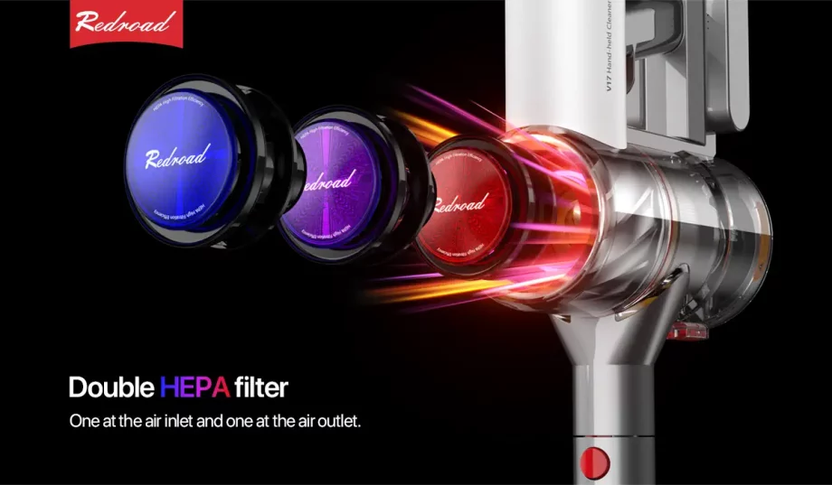 Le Redroad V17 possède deux filtres HEPA. Un à l’entrée et l’autre à la sortie, ils éliminent 99,97% des acariens, des moisissures, du pollen et des squames d’animaux qui déclenchent rhinites, asthme et allergies.