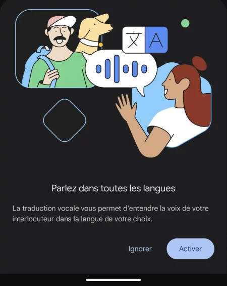 Une fonctionnalité qui est bluffante est le « Voice translate » cette fonctionnalité permet une traduction en temps réel des conversations. Elle transforme votre Pixel en un véritable interprète personnel. Concrètement, lorsque deux personnes parlent des langues différentes, le smartphone écoute, traduit et retranscrit les paroles de chacun à l’écran, en instantané. Cela permet de combler la barrière de la langue lors d’un voyage ou d’une conversation inattendue.