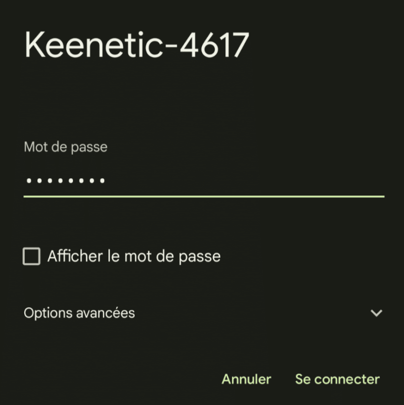 CONSEIL : utilisez un mot de passe complexe (fort) pour vous connecter à votre réseau Wi-Fi. Un mot de passe fort est prédéfini par défaut dans les appareils Keenetic, ce qui est difficile à deviner et prend beaucoup de temps à récupérer par une méthode de force brute. Vous pouvez vérifier la force du mot de passe ici . Pour créer un mot de passe complexe, vous pouvez utiliser un gestionnaire de mots de passe .