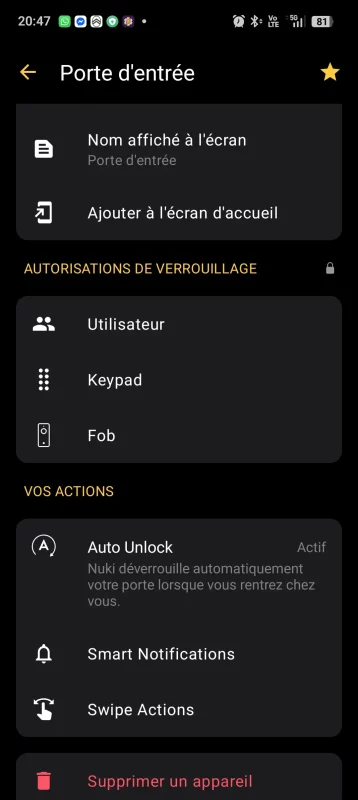 Dans mon installation, la serrure est configurée avec la fonctionnalité Auto Unlock, associée au Door Sensor et à la géolocalisation du smartphone. Concrètement, la porte se déverrouille automatiquement lorsque j’arrive à proximité de la maison.
