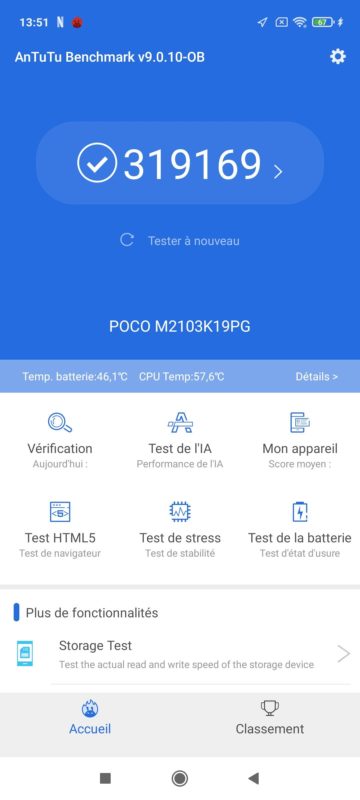 On pourra remarquer que ce Poco M3 Pro nous offre un score honorable pour un appareil à ce prix et équipé d’un SOC Mediatek et surtout compatible 5G ! Donc sur ce point, c’est déjà une belle surprise moi qui m’attendait à bien pire quand on voit ce que certaines marques proposent dans ce segment tarifaire. Les 6 Go de RAM aident c’est indéniable. On peut comparer ce téléphone à un Samsung Galaxy S8.