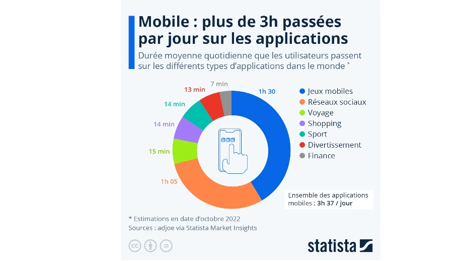Selon diverses études, et notamment la plus récente faite par Adjoe, un utilisateur moyen de smartphone passe en moyenne trois heures par jour sur des applications mobiles. Ces applications comprennent les réseaux sociaux, les jeux, les applications de messagerie, les services de streaming, et bien d’autres. Les jeux sur smartphones ont d’ailleurs atteint une proportion de 40%% avec notamment 1h30 d’utilisation.