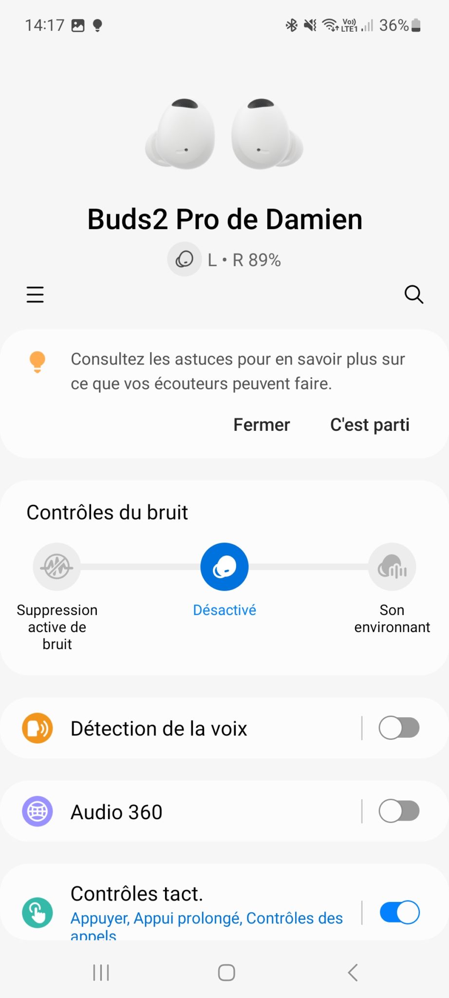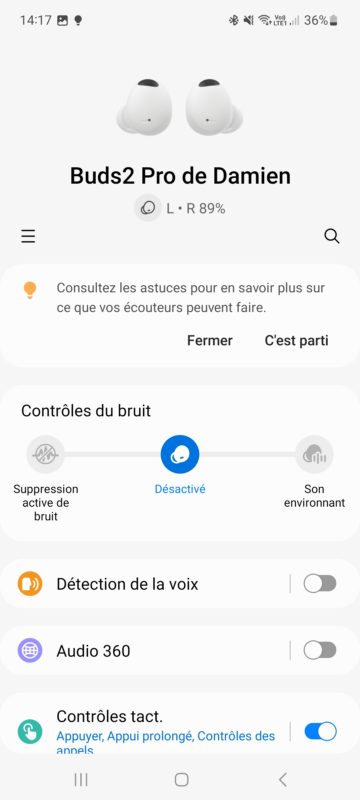 Samsung dispose d’une application « Galaxy wearable » qui permettra de gérer toutes les options : contrôles du bruit, détection de la voix, audio 360, contrôles tactile, …