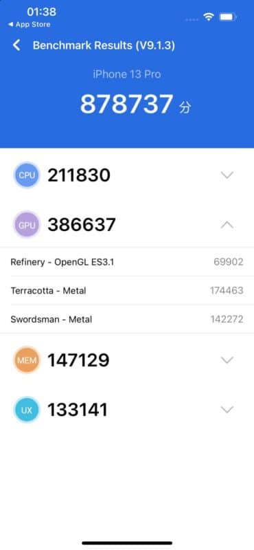 Malheureusement, l’outil Antutu sous IO ne permet pas de comparer des iPhone avec des smartphones Android.