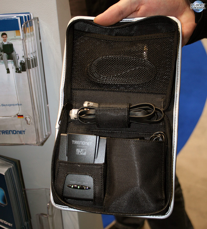 TRENDnet fourni en prime avec le produit une petite valisette de rangement de la taille d’une pochette de CD/DVD, dans laquelle on trouve une alimentation secteur, un câble réseau, ainsi qu’un câble USB. Présent également les protocoles de sécurité WEP, WPA, WPA2…