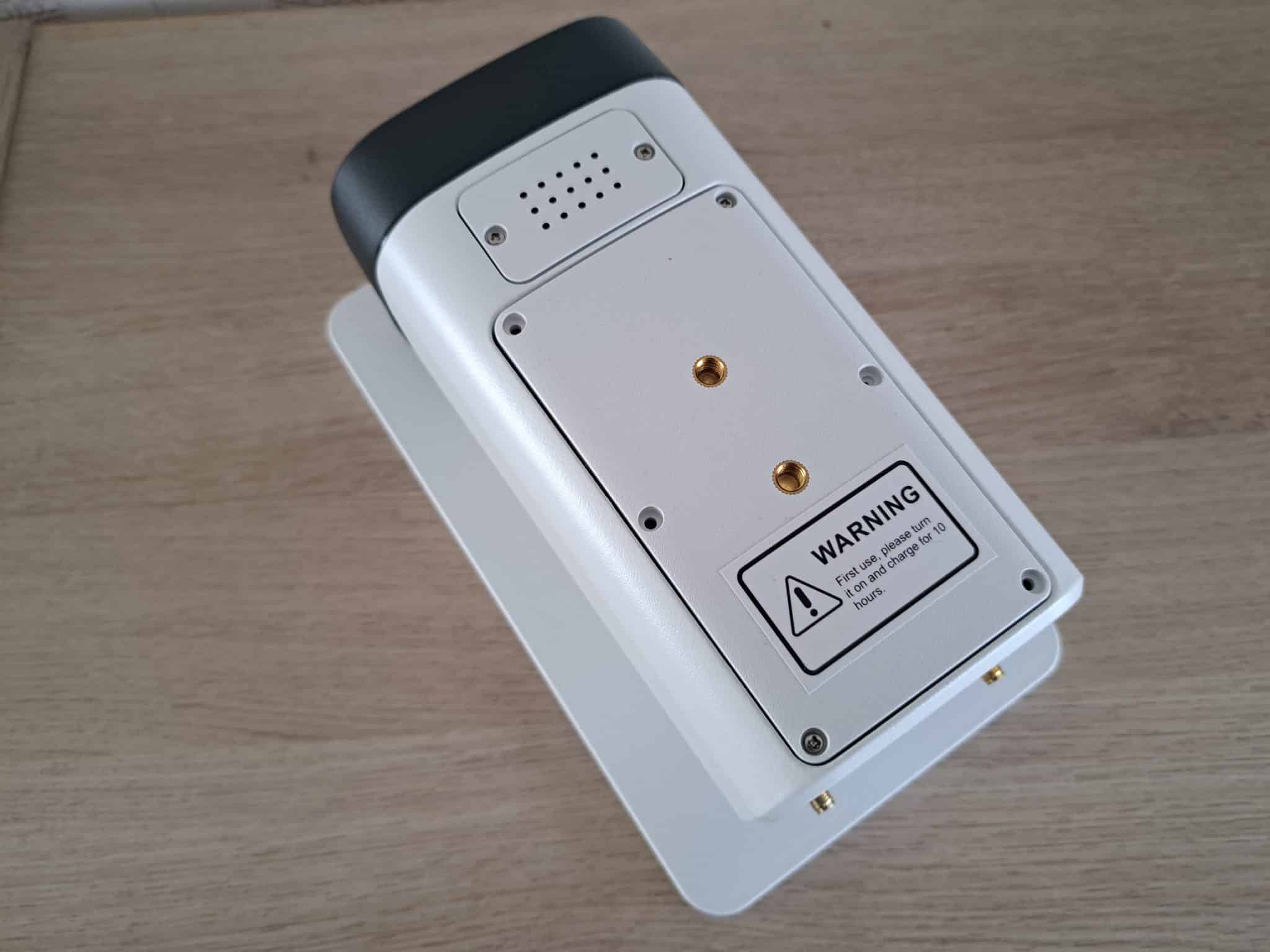 Sa conception robuste repose sur un boîtier et un support entièrement en métal. Le panneau solaire de 3,5 W, situé sur le dessus du boîtier, permet une recharge continue des quatre batteries 18650. À l’arrière, on trouve deux antennes Wi-Fi orientables et amovibles.
