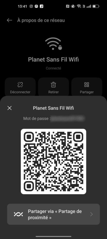 Là vous verrez l’option « partager ». Sélectionner l’option et vous verrez que le téléphone va vous afficher un QR code, il ne vous restera plus qu’à scanner le QR code avec l’autre téléphone pour que celui-ci soit la possibilité de se connecter au réseau Wi-Fi choisi.