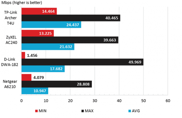 Selon la distance entre le routeur et l’adaptateur le résultat est très variable. A proximité immédiate du routeur, notre adaptateur propose de loin la meilleure solution, bien qu’on puisse se demander s’il ne serait pas plus judicieux de raccorder notre pc à un câble Ethernet au vu du faible parcours à effectuer. Entre 8 et 15 mètres la bande 2,4 Ghz offre ses meilleurs résultats. Mais on peut constater combien la bande de fréquence 5 Ghz offre de meilleurs résultats justifiants à eux seuls l’intérêt de cette technique. Mais il faut appairer cette clef avec un routeur compatible !