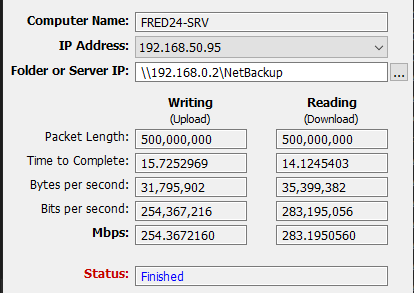 Poursuivant notre tour du produit en testant les débits de ce produit via un protocole assez simple consistant à mesure le débit lors du transfert d’un fichier de 500 Mo (en lecture et en écriture). La destination est un NAS Synology en SHR avec agrégation de 2 liens de 1 Gb et un switch Netgear Smart. Ces 2 produits dans cette configuration nous permettent d’écarter tout problème de goulot d’étranglement réseau et donc de réellement mesurer la vitesse fournie.