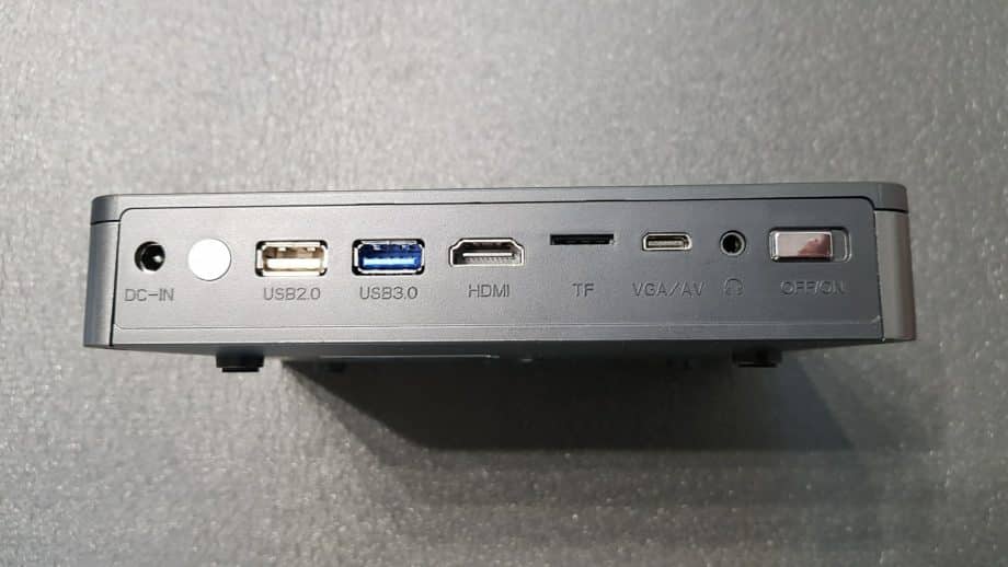 Sur l’arrière, toutes les entrées et sorties de la connectique : une entrée d’alimentation, un bouton de mise en veille, deux port USB permettant 2.0, un port USB 3.0, un port HDMI, un slot micro-SD, un connecteur vga, une sortie jack 3,5 mm et commutateur on/off général.