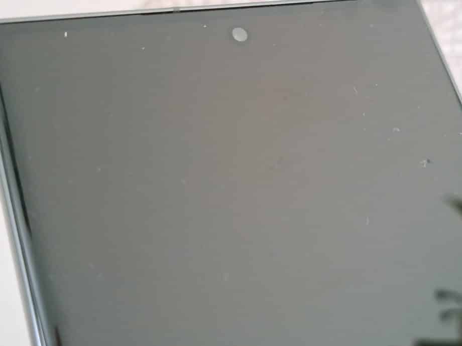 Commençons par une présentation générale du Samsung Galaxy S23 Ultra. À l’avant, l’écran AMOLED de 6,8 pouces est remarquable, sans encoche visible pour la caméra frontale, mais plutôt un petit poinçon situé en haut de l’écran. De plus, l’écran est joliment intégré dans un châssis en aluminium qui épouse légèrement les bords, ce qui donne une impression agréable en main.