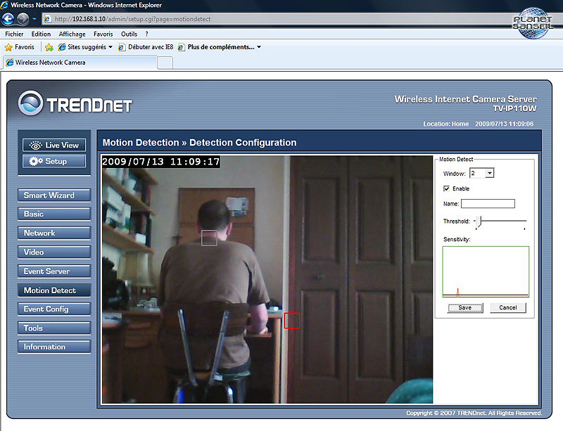 Dans le menu suivant, vous pouvez spécifier un emplacement distant dans lequel seront stockées les captures d’images que vous obtenez en configurant les évènements dans le menu Motion Detect et Event Config. Vous avez le choix entre l’envoi vers un serveur ftp et l’envoi par courriel. C’est ici aussi que vous pourrez définir la sensibilité de la détection des mouvements. Dans le menu Event Config, vous pouvez paramétrer un préfixe pour les images. Ce dernier ce transforme en un sous-dossier si vous décidez d’envoyer les captures vers un serveur ftp. Ce dernier contiendra lui-même un dossier dont le nom est la date de la capture.